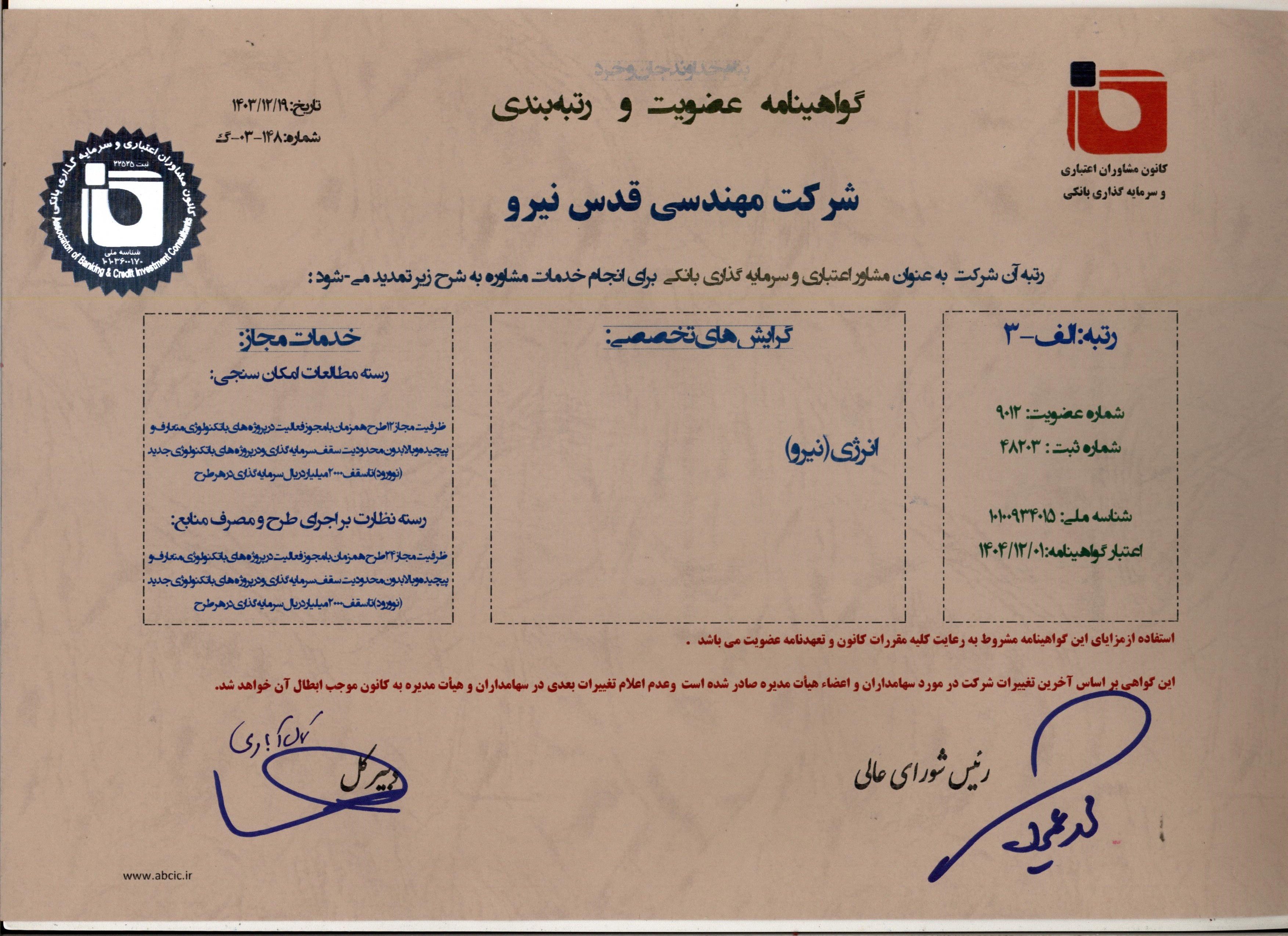 تمديد گواهينامه عضويت و رتبهبندي شركت مهندسي قدس نيرو در كانون مشاوران اعتباري و سرمايهگذاري بانكي1404
