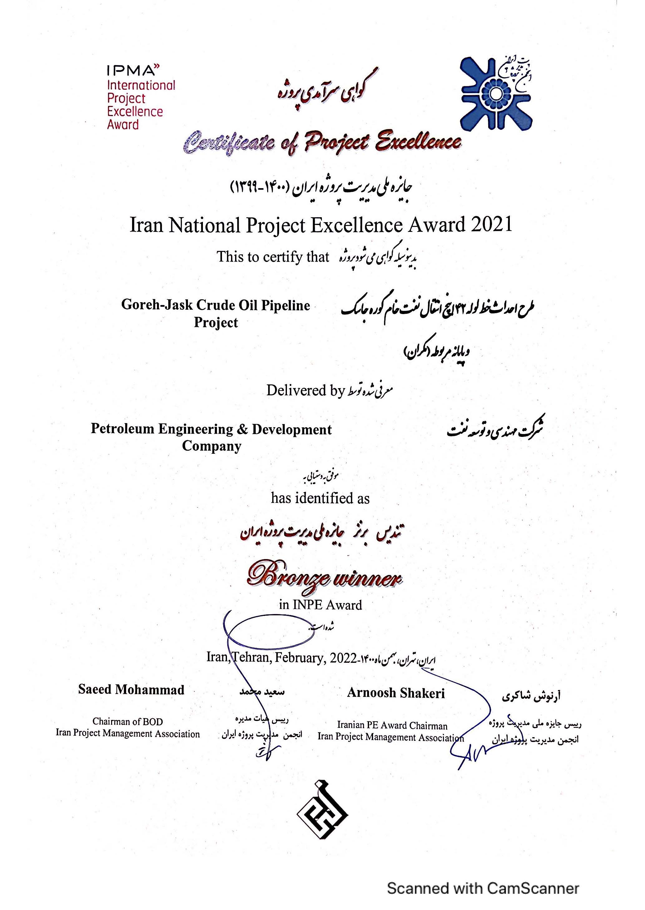 گواهي سرآمدي پروژه گوره جاسك و كسب تنديس برنز