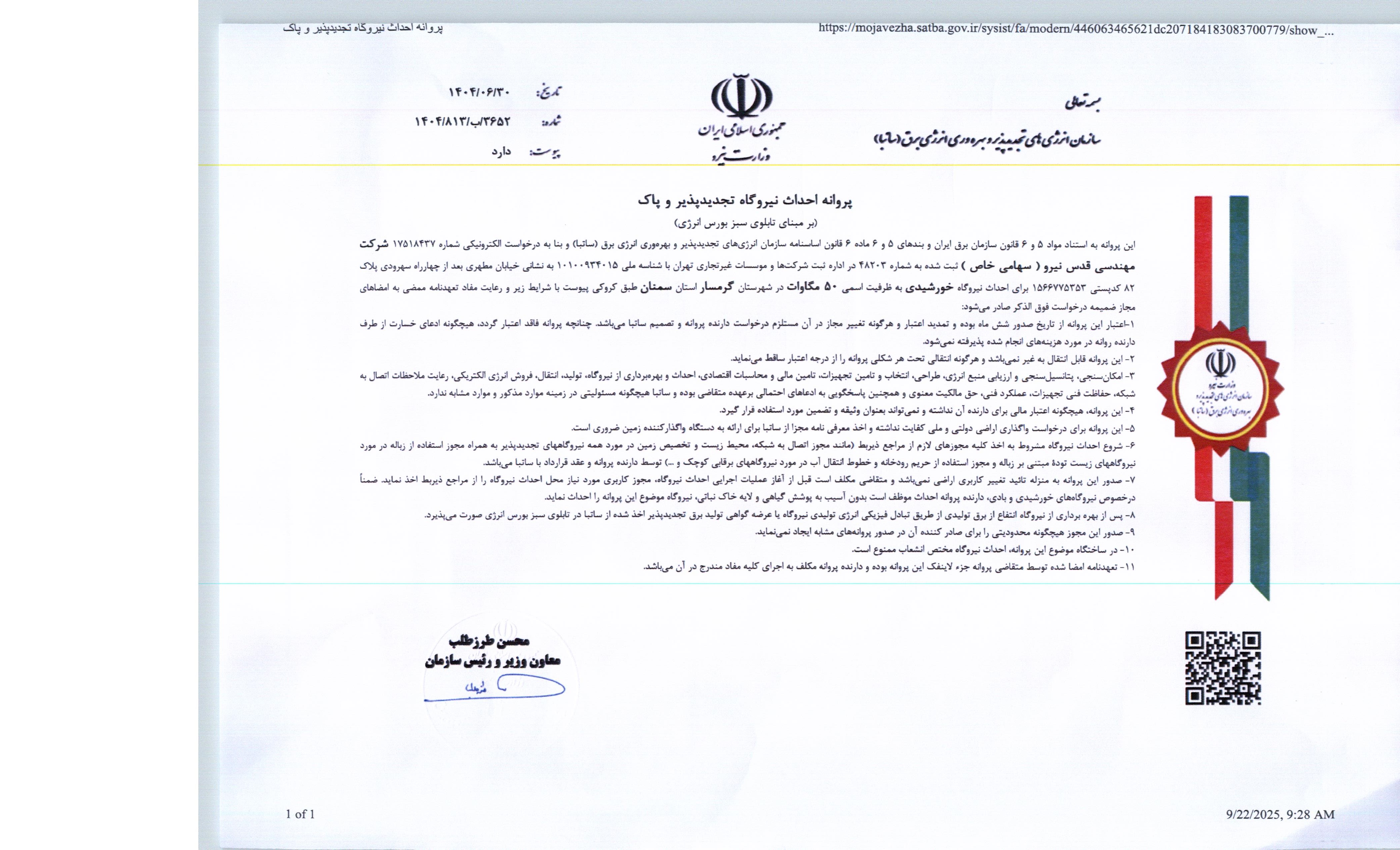 گواهي صلاحيت پروانه احداث نيروگاه هاي تجديدپذير و پاك
