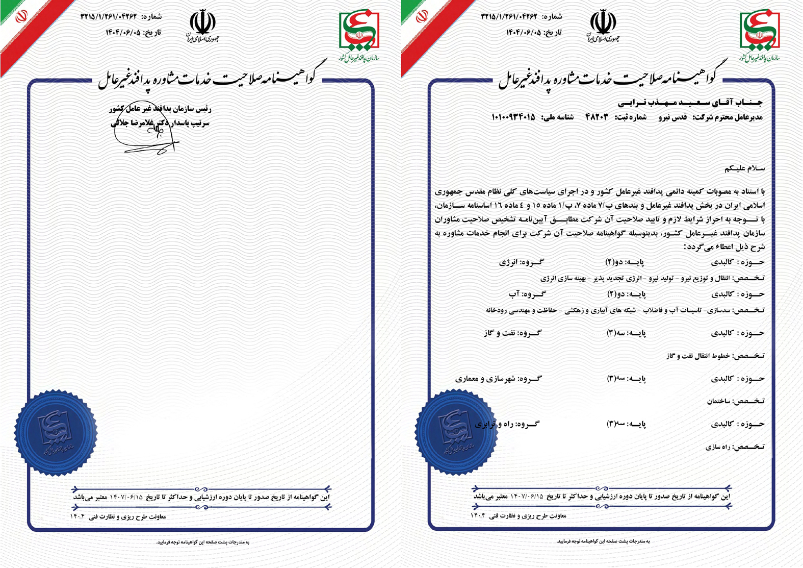 گواهي نامه صلاحيت خدمات مشاوره پدافند غير عامل