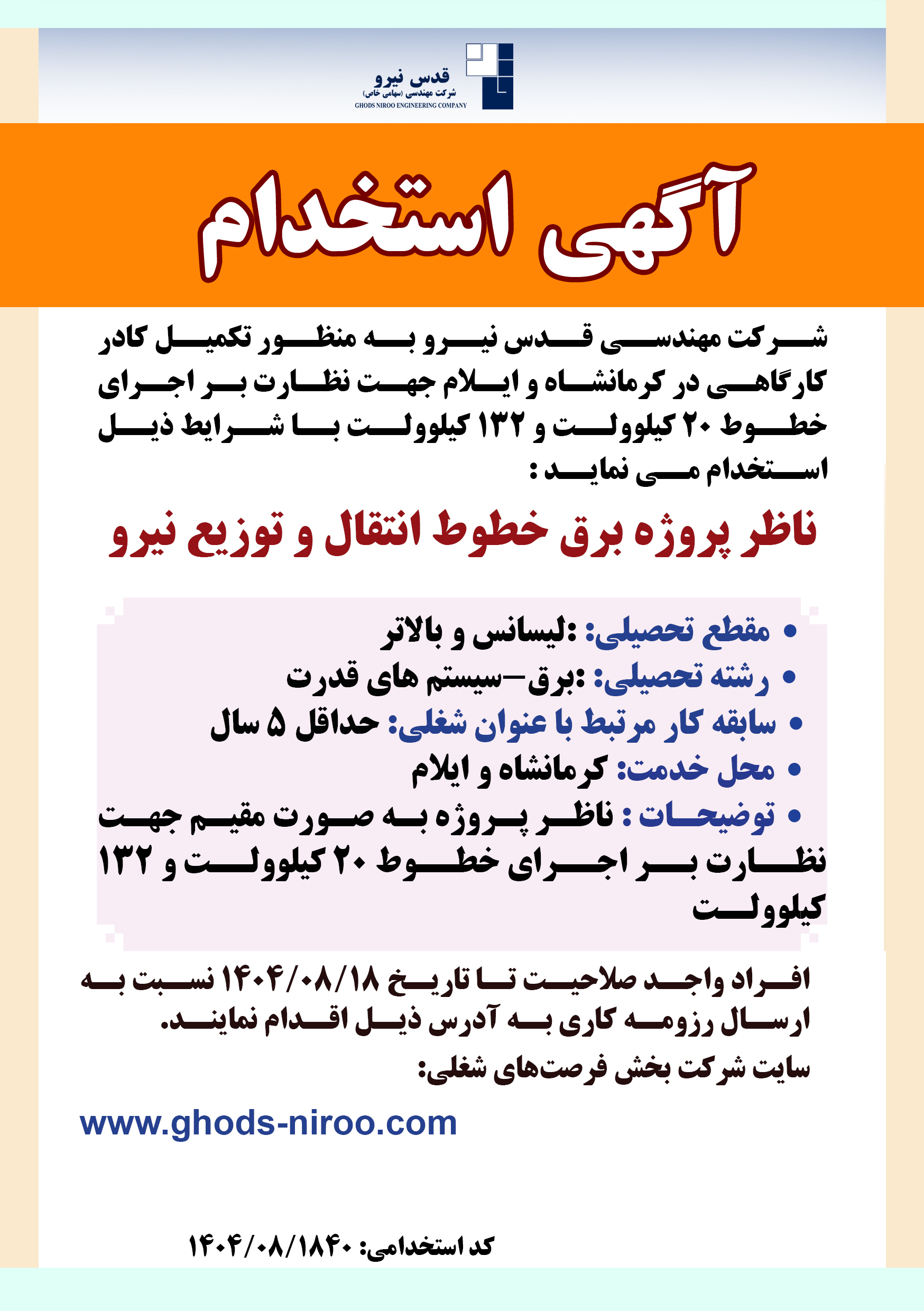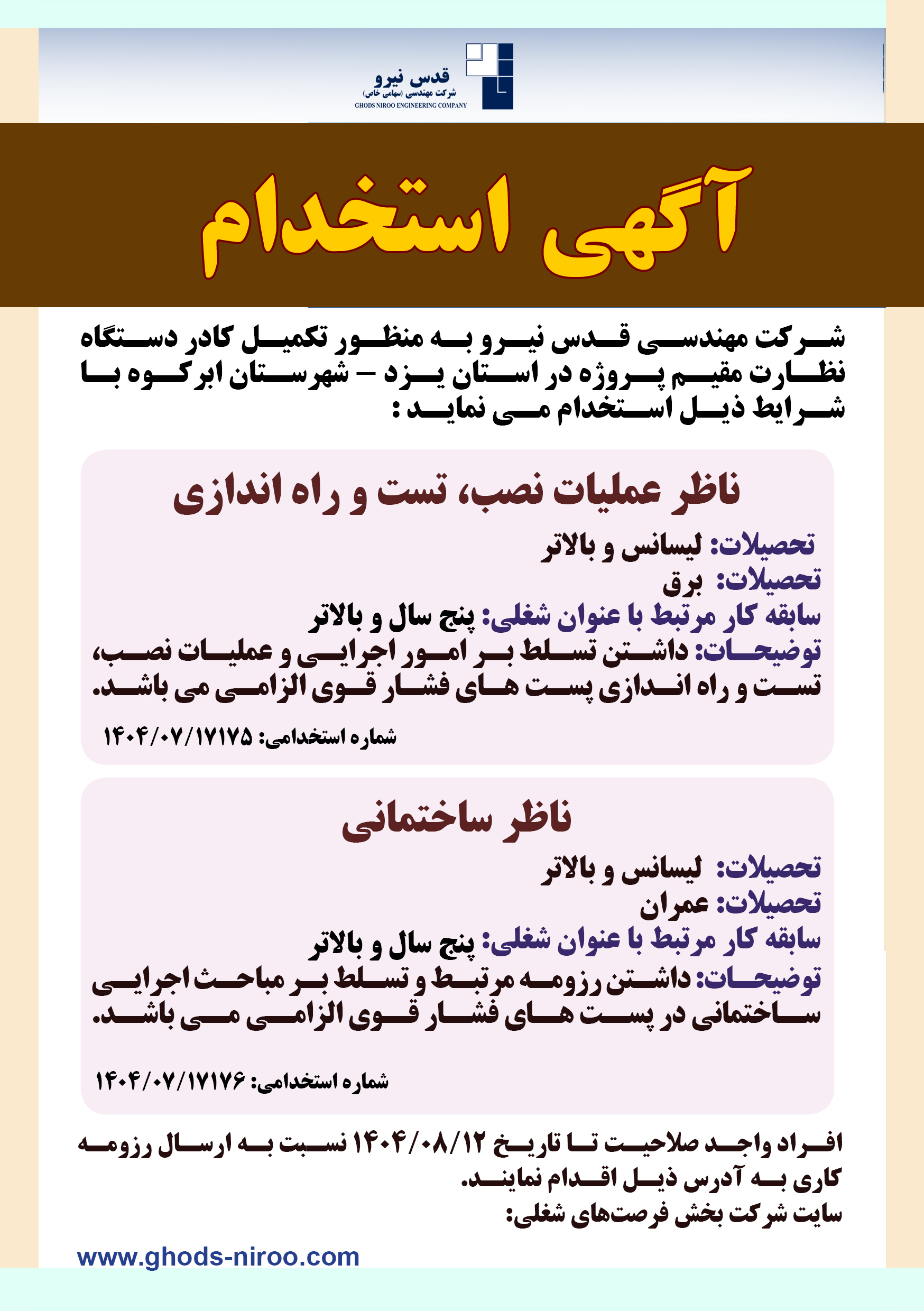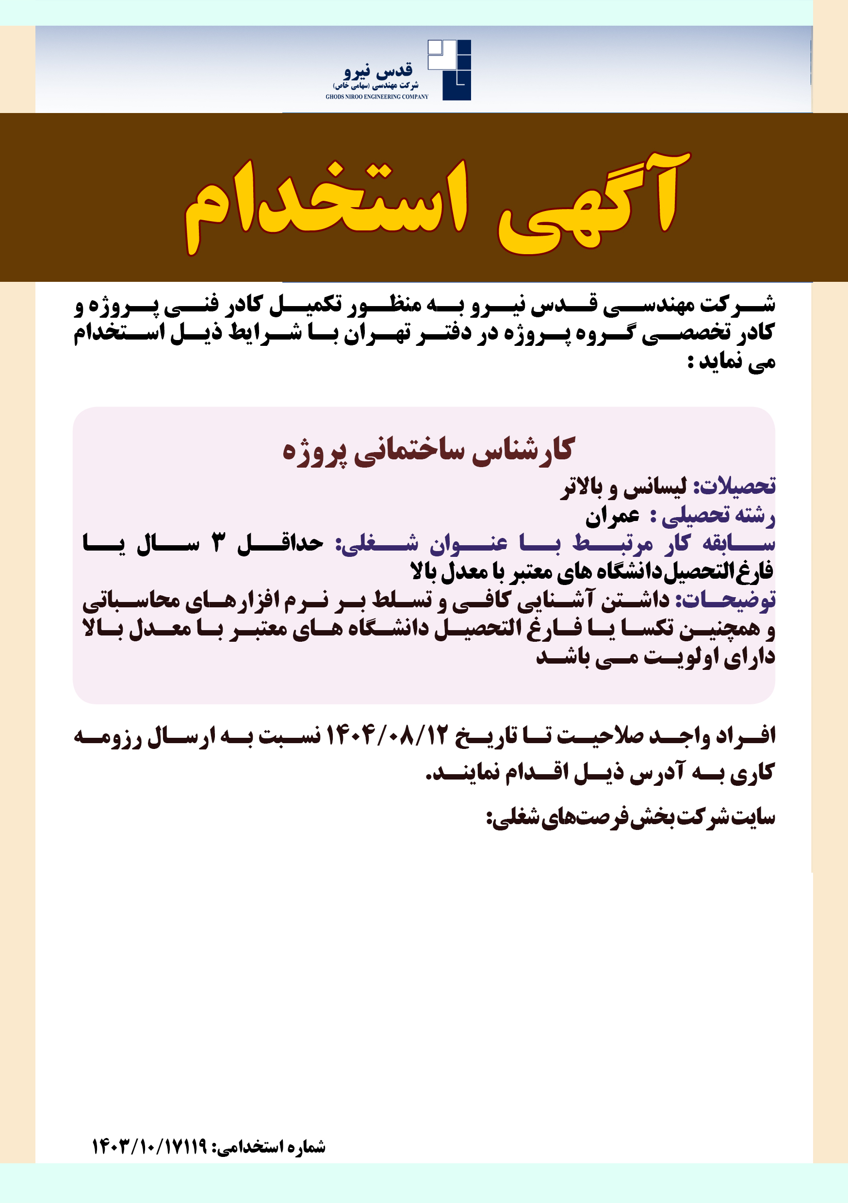 فرصتهاي شغلي 5 آبان 1404 شركت مهندسي قدس نيرو