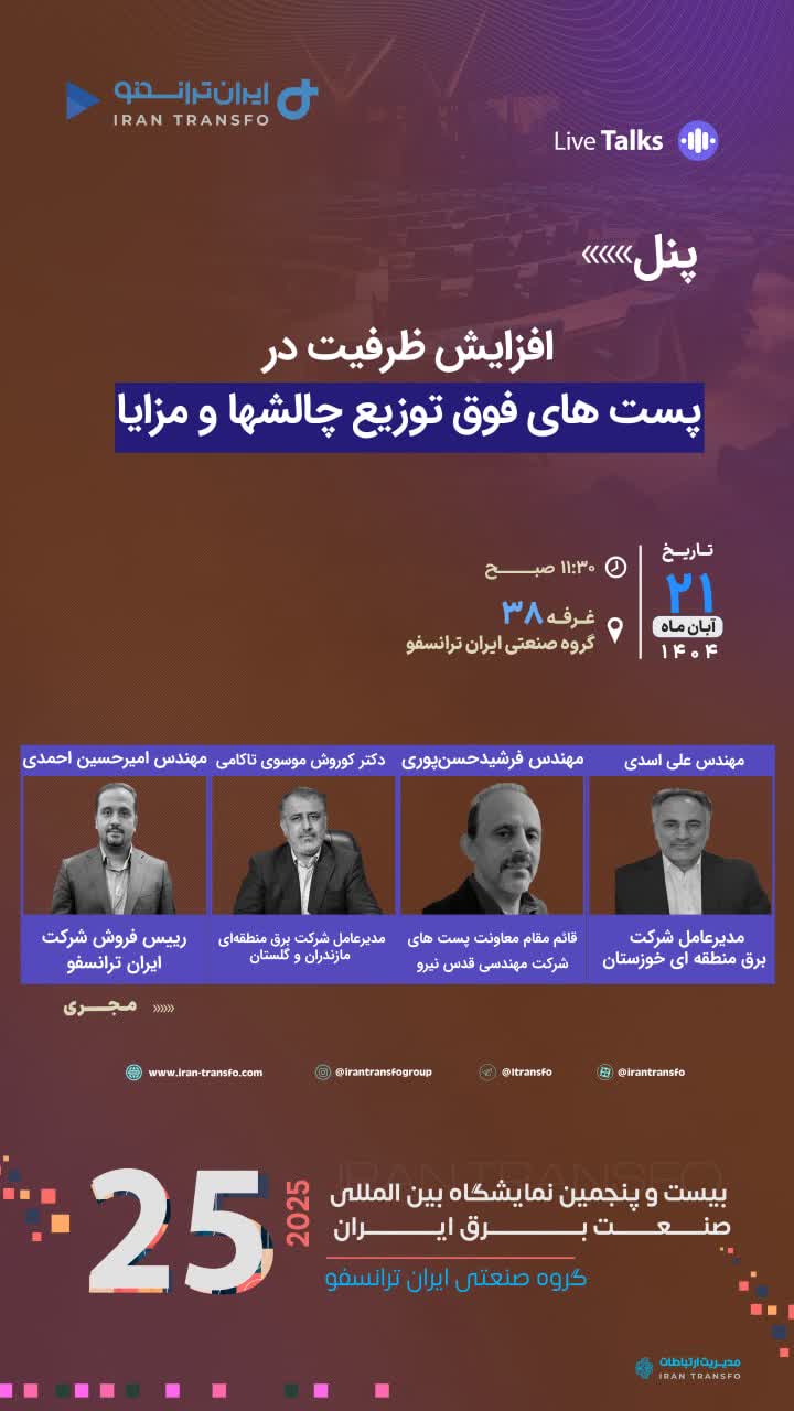 در حاشیه بیست و پنجمین نمایشگاه بین المللی صنعت برق ایران و پیرو دعوت به عمل آمده در روز چهارشنبه ۲۱ آبان پنل تخصصی بررسی چالشها و فرصتهای افزایش ظرفیت پستها با حضور مدیران عامل برق منطقهای خوزستان و برق منطقهاي مازندران و نماینده شرکت مهندسی قدس نیرو جناب آقای مهندس فرشید حسن پوری در محل غرفه شرکت ایران ترانسفو برگزار شد.